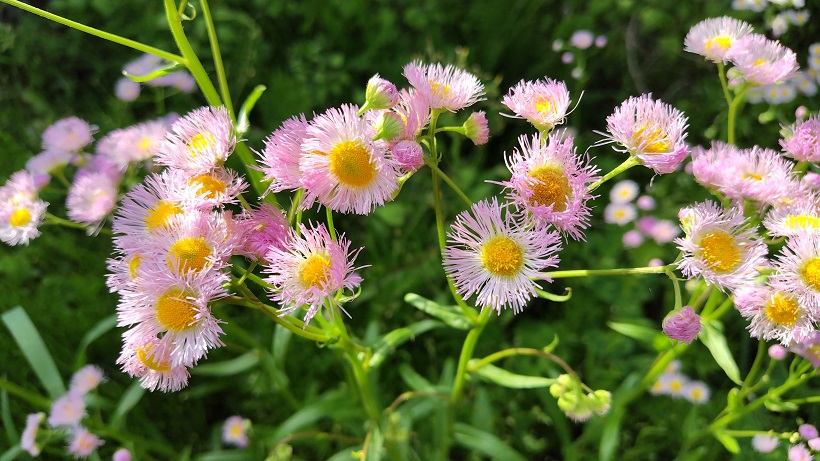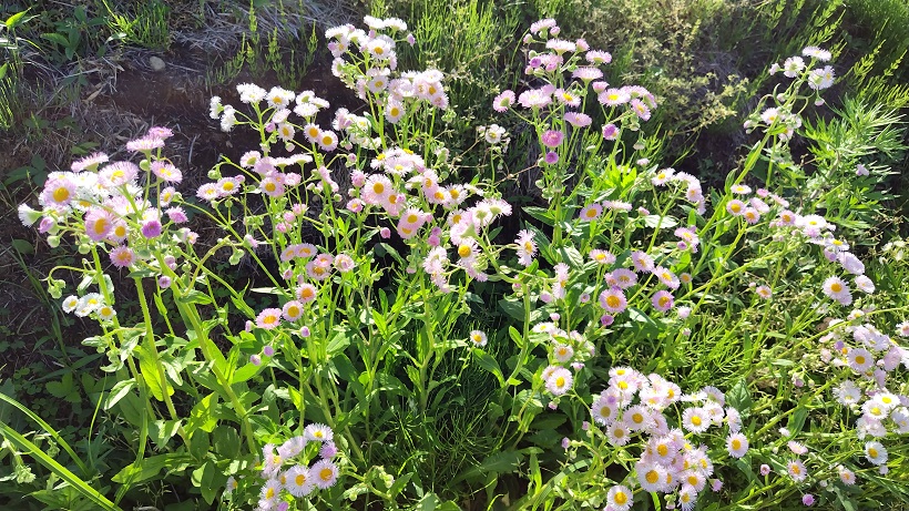 キク科 ムカシヨモギ属 関東以南 帰化植物 和名の由来は 秋に咲く同じキク科のシオン(紫苑)にちなみ 春に咲くシオンということから春紫苑 茎は空洞 蕾の時に下を向いている 花期が4月初めから咲き始める 花色が白・ピンク・紅色など色幅が広い 舌状花が線のように細くたくさんついている 花が2センチぐらい 草丈は80cmくらい 葉は茎を抱き 根生葉がある それらの特徴で似ているヒメジォオンとの見分けになる 大正期に日本に入ったころは園芸種 その後繁殖力の強さと環境に順応性があることから雑草化した 空き地や田の畔や休耕地などいろいろなところに咲いている 「びんぼう花」という少し不名誉な愛称で子供たちにはままごと遊びに使われて結構人気の花 愛らしいからね〜♪ 何故びんぼう花と呼ばれるのかは・・・ 手入れの届かない家の庭にも自然にいつの間にか生えて咲いてくる きちんと草取りをされて手入れの届いた家の周りには咲かないかららしい 花言葉: 追想の愛 蕾が下を向いてうつむいているように見えること 茎が空洞で空ろなことから 過ぎた愛を追想しているというイメージ 過ぎた愛を懐かしむ 深い愛の日々を追想する時間は切なさと寂しさと哀しみを連れてくる その想い出はまた明日を生きる糧 心の宝物