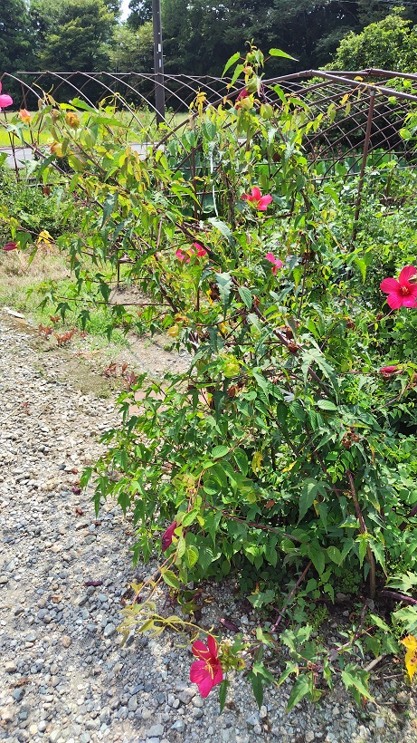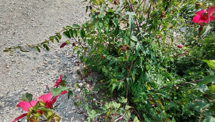 2025年 どこからか種が運ばれて庭のタイタンビカスの株間に生えて三年目のクマヤナギ 根が強いので新しい蔓が伸びて切ってを繰り返している | ||||||||||||||||||||